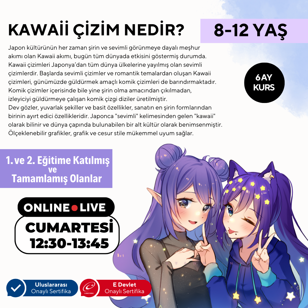 Ders Bilgisi: İlk iki seviyede öğrenilenlerle, hayal ettikleriniz ile manga serisi hazırlamak, anime karakterlere hareket ekleme ve dijitalleştirme teknikleri, ileri seviyede procreate programı ile tablet veya bilgisayarda dijital çizim öğretmek